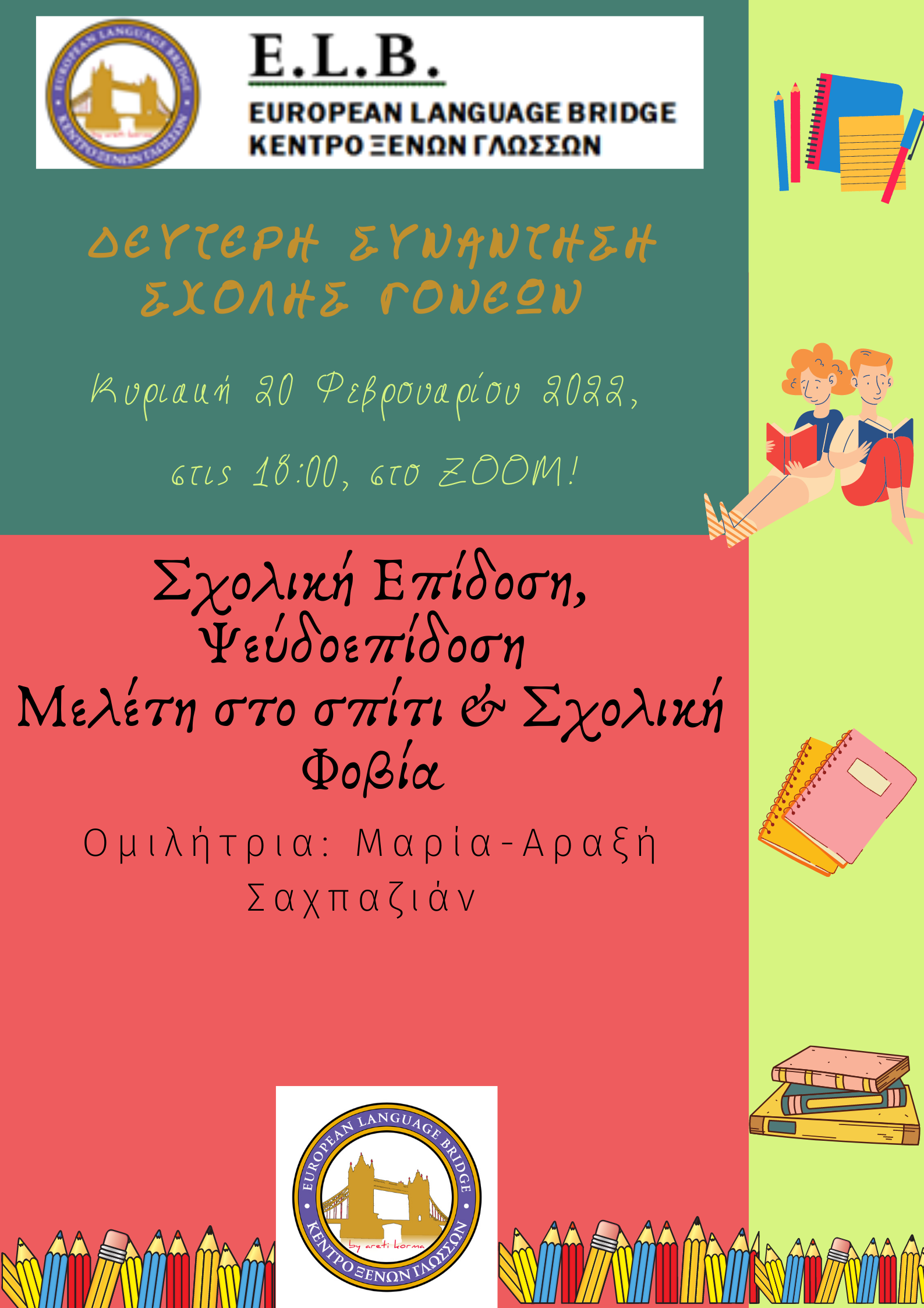 Ανακοινώσεις · Δευτερη Συνεδρία του E.L.B.’s Parents’ Club 11 Φεβρουαρίου, 2022·Έχουμε τη χαρά να σας προσκαλέσουμε στη 2η Συνάντηση της Σχολής Γονέων του E.L.B., την Κυριακή… Διαβάστε Περισσότερα