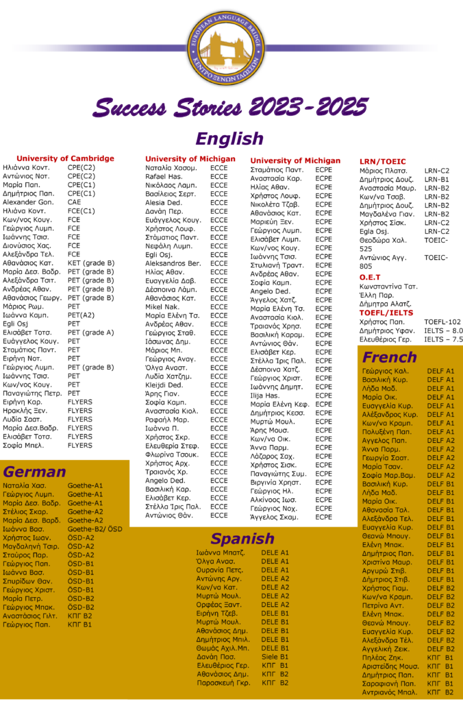 Από το Lower και το Proficiency των Πανεπιστημίων Michigan & Cambridge, μέχρι τα απαιτητικά IELTS και τα πτυχία στα Γαλλικά, Γερμανικά και Ισπανικά!